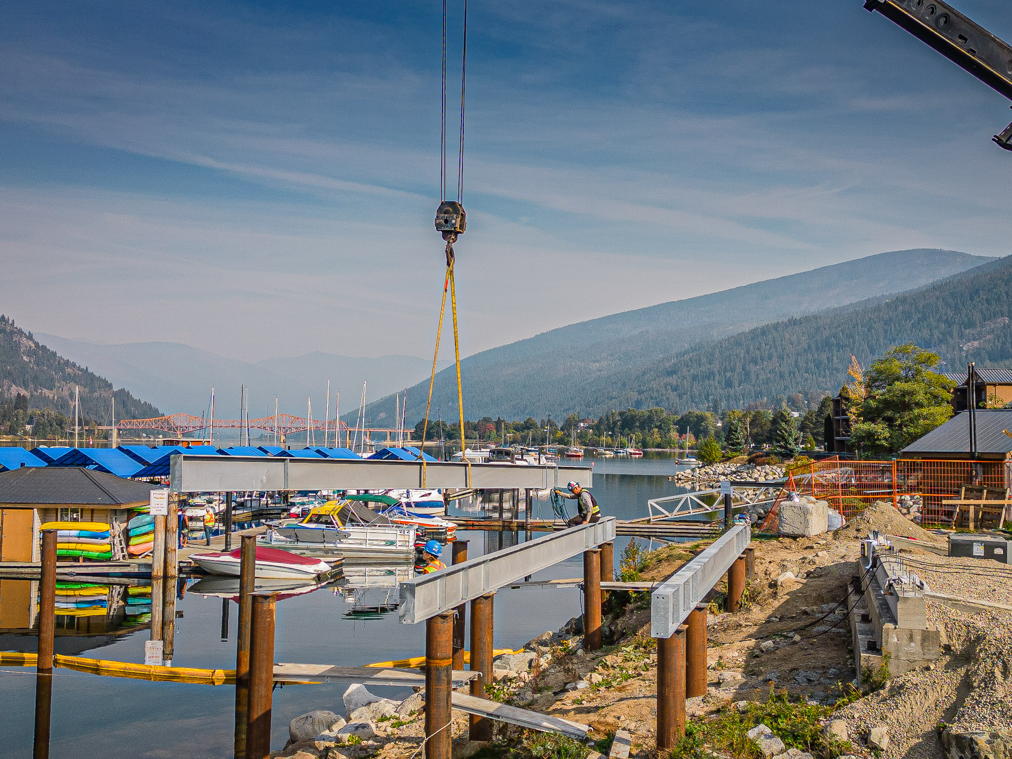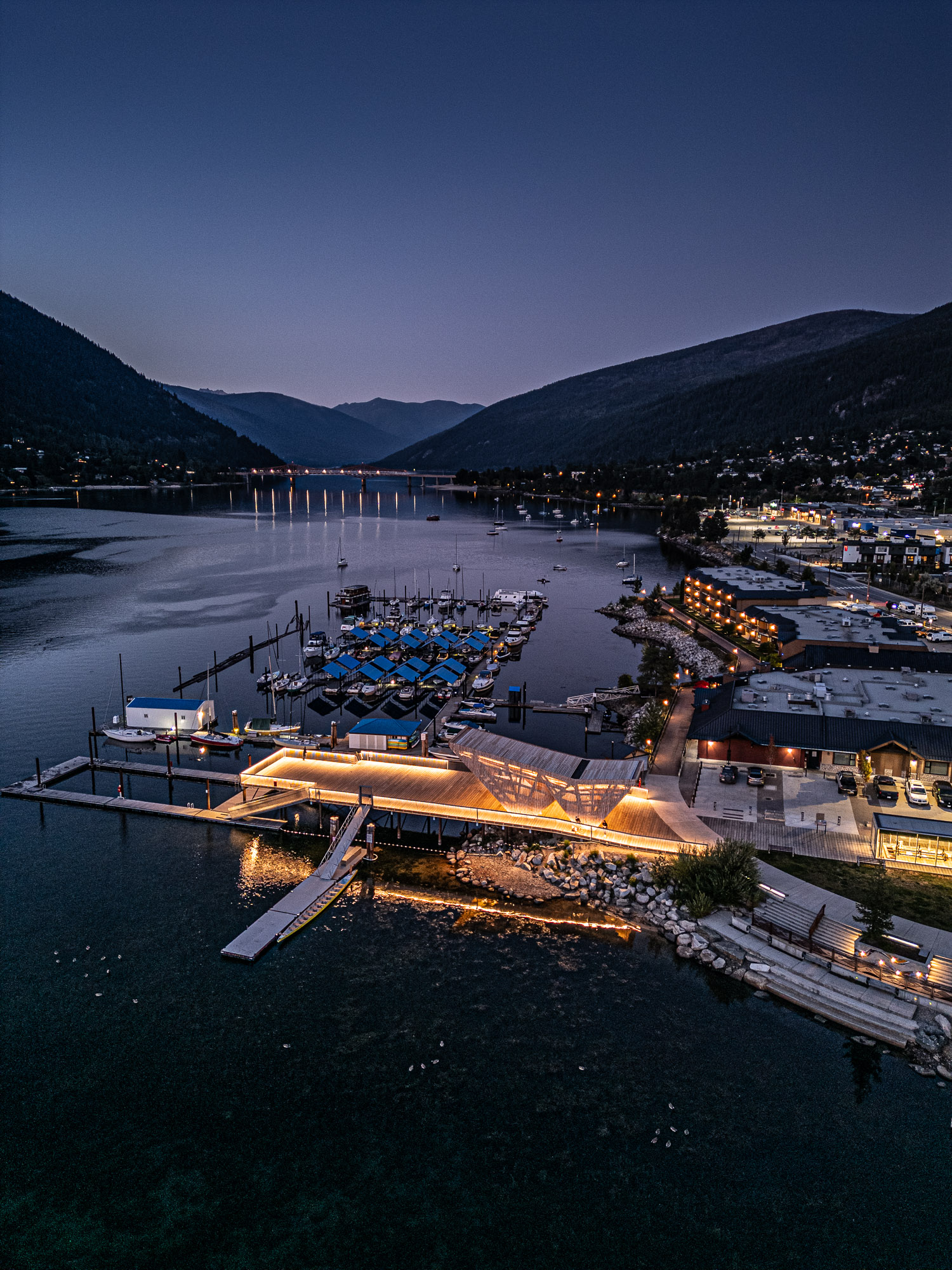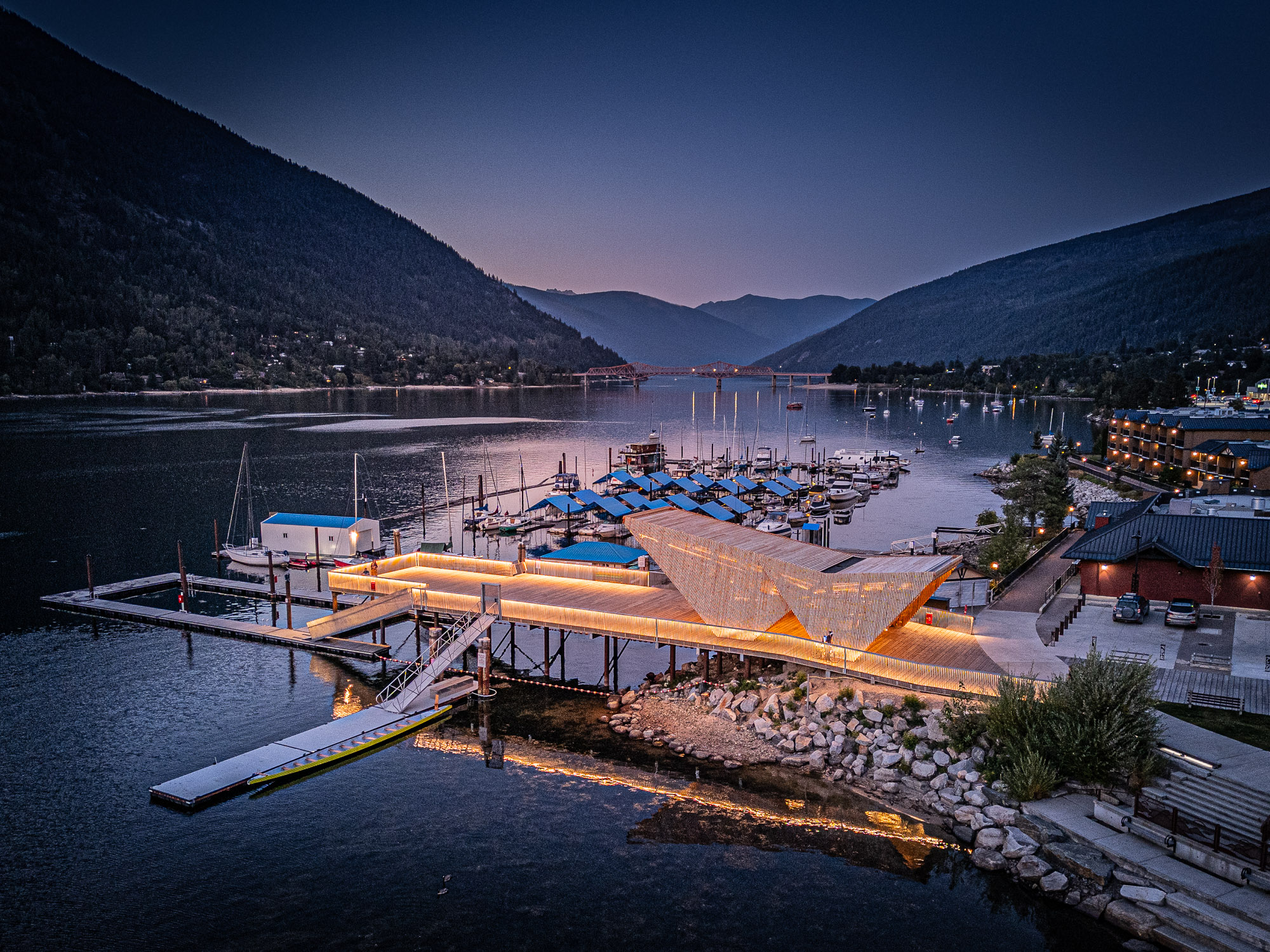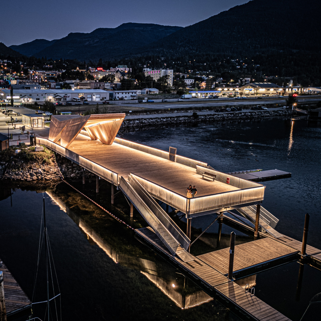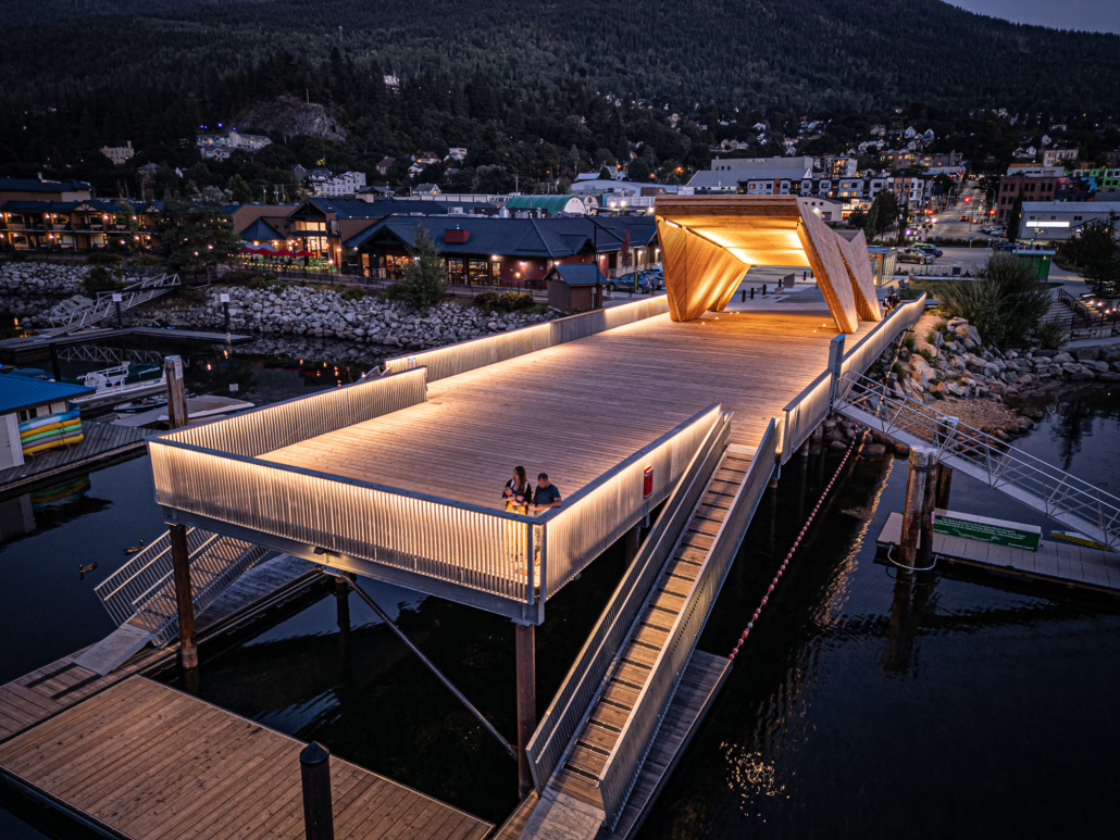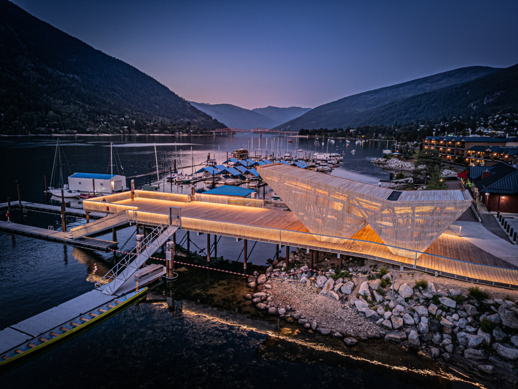 The completed Hall Street Pier Replacement project is a major marine infrastructure upgrade located on the West Arm of Kootenay Lake in Nelson, BC. The project involved the deconstruction of the existing wooden pier and the construction of a new, enlarged facility supported by open-end steel pipe piles. Features include an extensive structural steel and wood timber framework, floating docks, a striking glulam wood exterior canopy, a unique swimming enclosure, and a dedicated glass pavilion housing the historic, record-setting Ladybird speedboat. Designed by Stanley Office of Architecture (SOA) and MBAC, the pier serves as a welcoming four-season gateway connecting historic downtown Baker Street directly to the waterfront.
