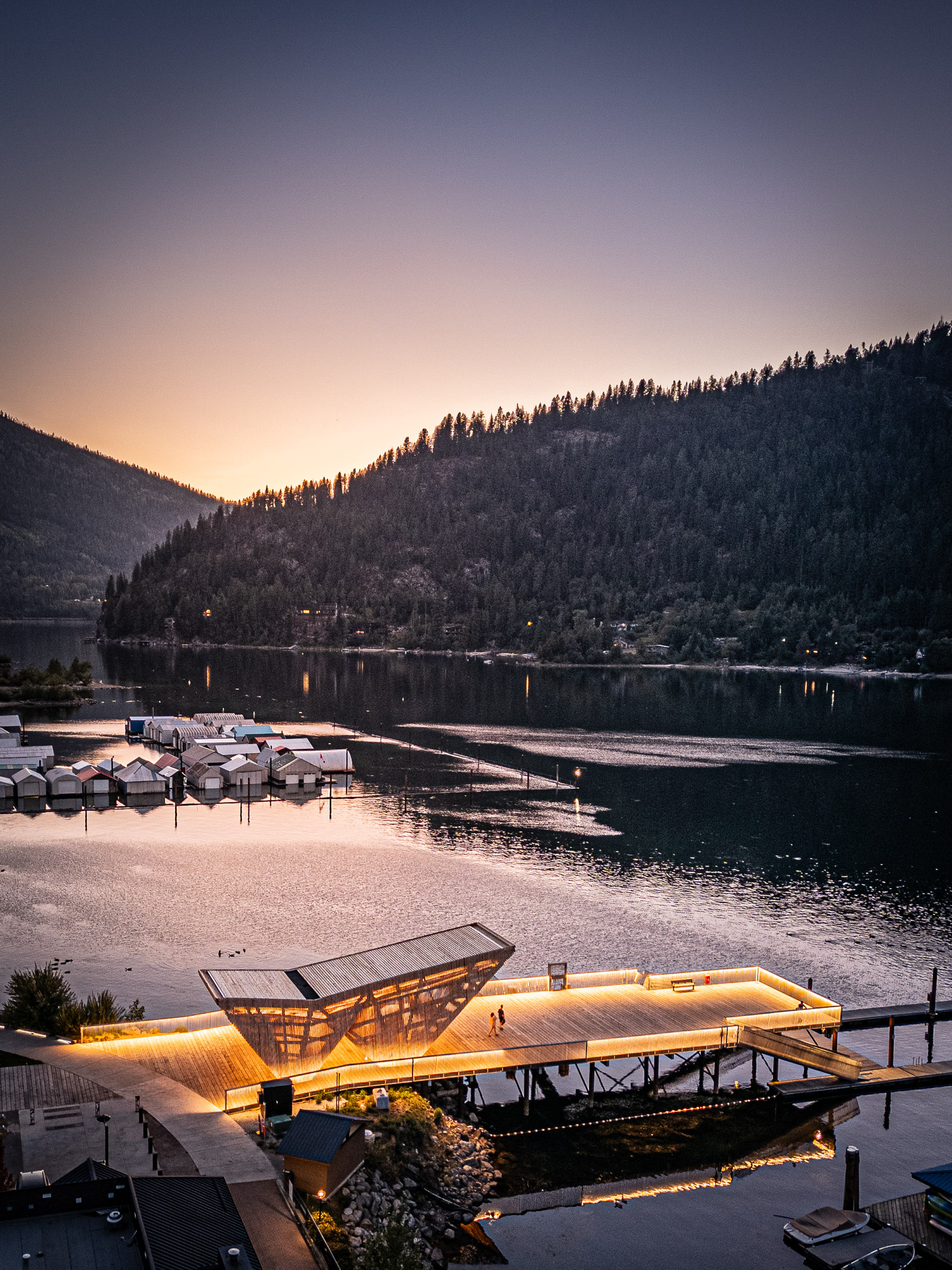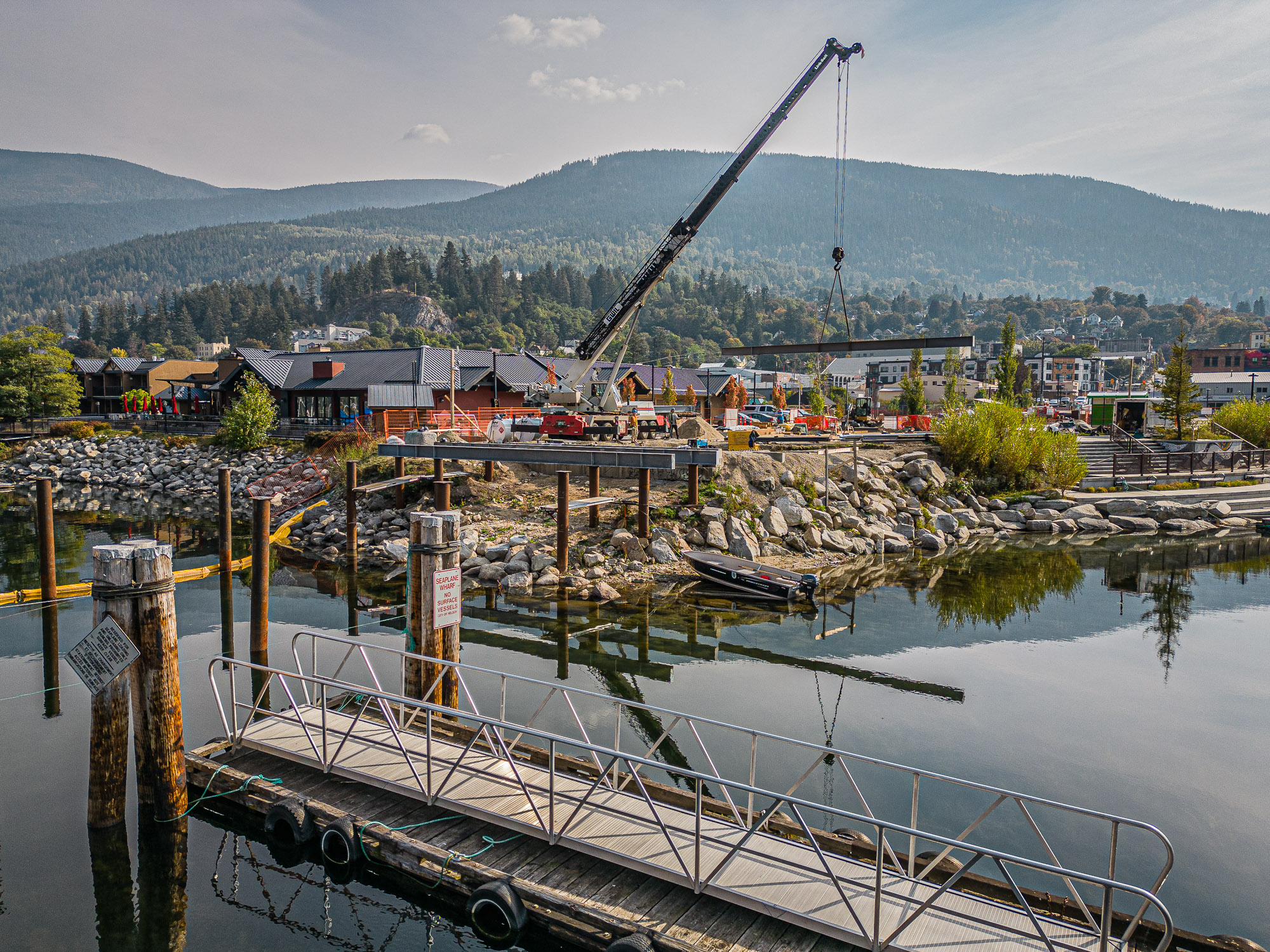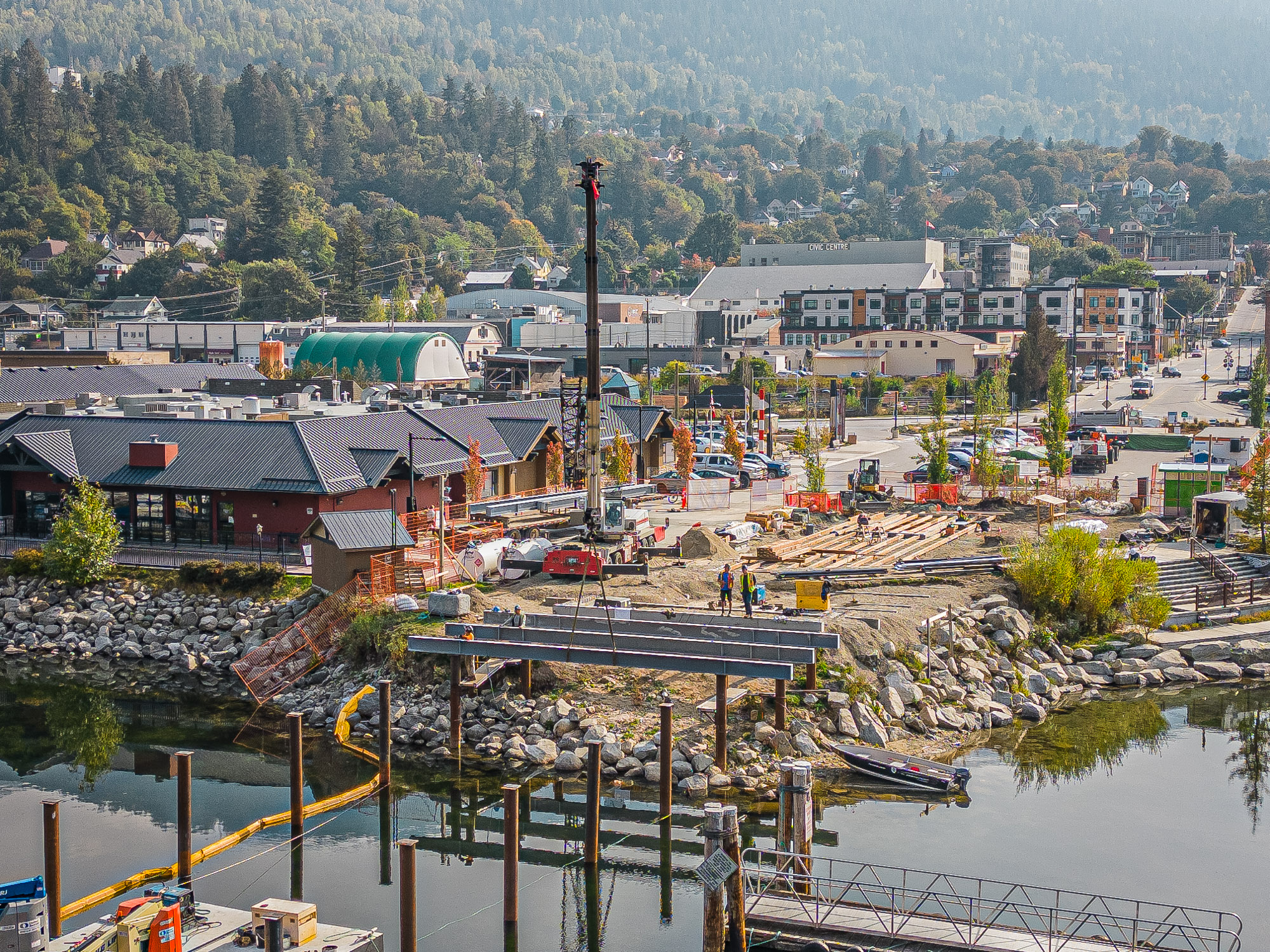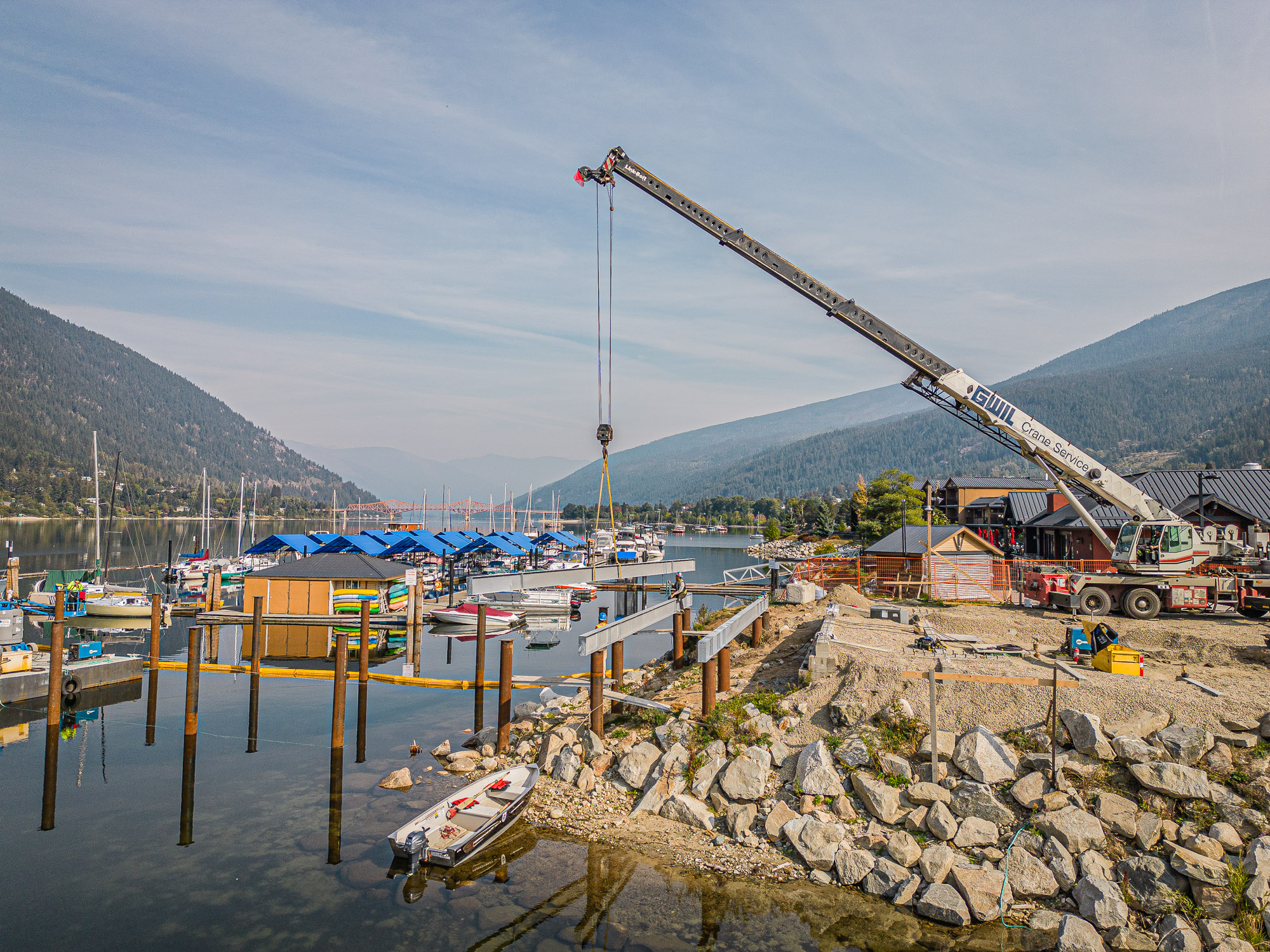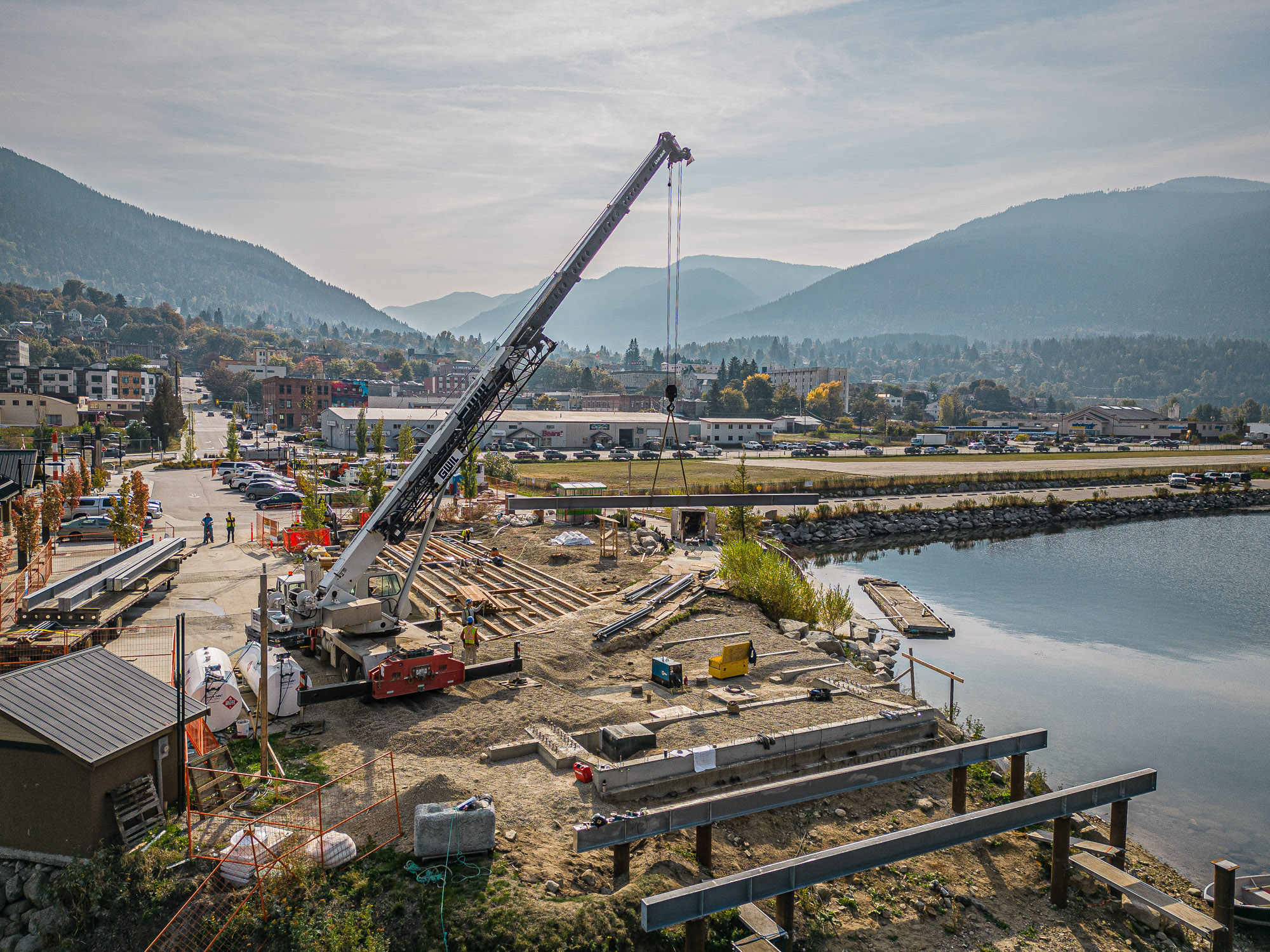 The completed Hall Street Pier Replacement project is a major marine infrastructure upgrade located on the West Arm of Kootenay Lake in Nelson, BC. The project involved the deconstruction of the existing wooden pier and the construction of a new, enlarged facility supported by open-end steel pipe piles. Features include an extensive structural steel and wood timber framework, floating docks, a striking glulam wood exterior canopy, a unique swimming enclosure, and a dedicated glass pavilion housing the historic, record-setting Ladybird speedboat. Designed by Stanley Office of Architecture (SOA) and MBAC, the pier serves as a welcoming four-season gateway connecting historic downtown Baker Street directly to the waterfront.